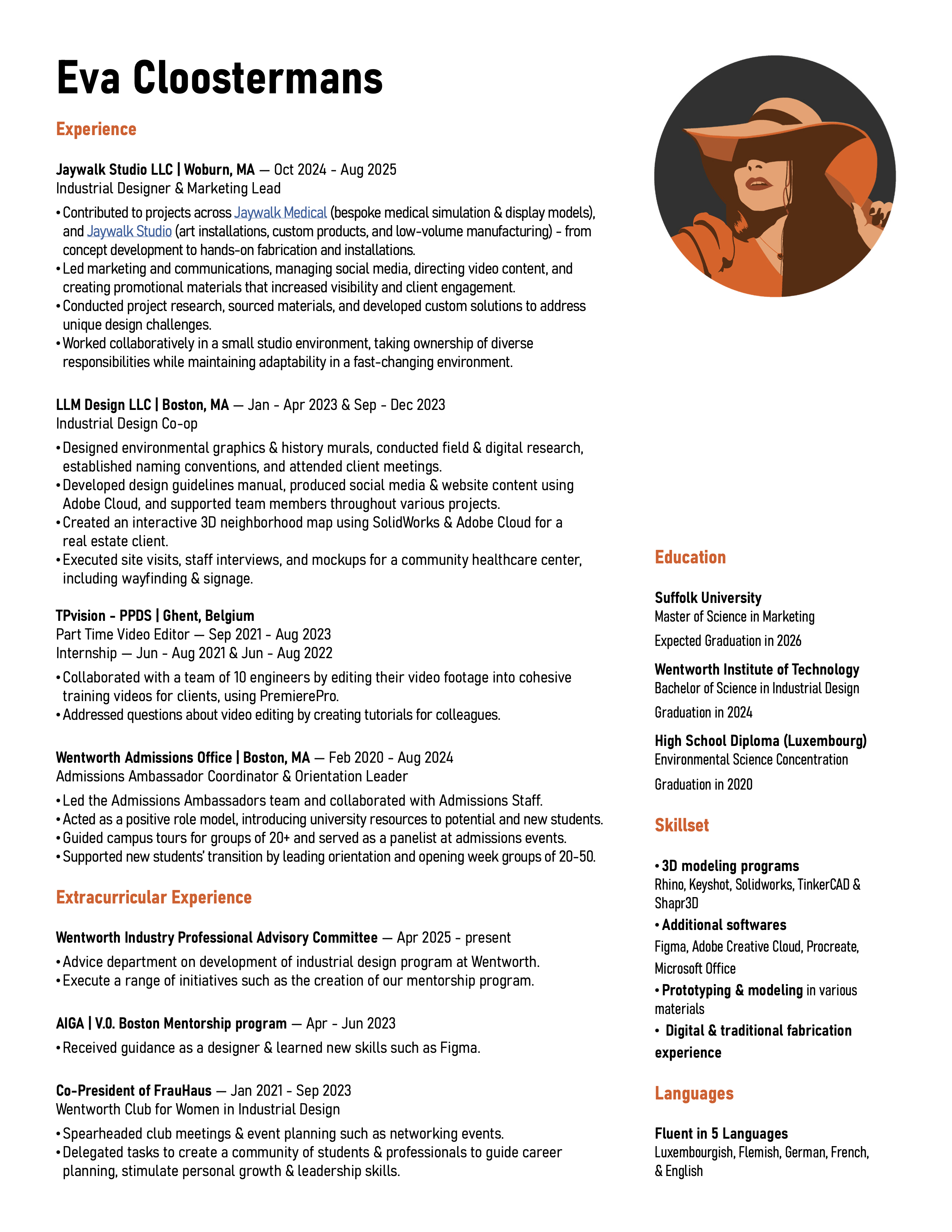 I’m a Boston-based industrial designer with experience in medical simulation models, art installations, digital fabrication, environmental graphics, and end-to-end digital content creation for campaigns, advertising, and social media. I’m currently pursuing a Master of Science in Marketing at Suffolk University, building on my design background to deepen my insights into marketing research, data-driven marketing, human factors, and product development.